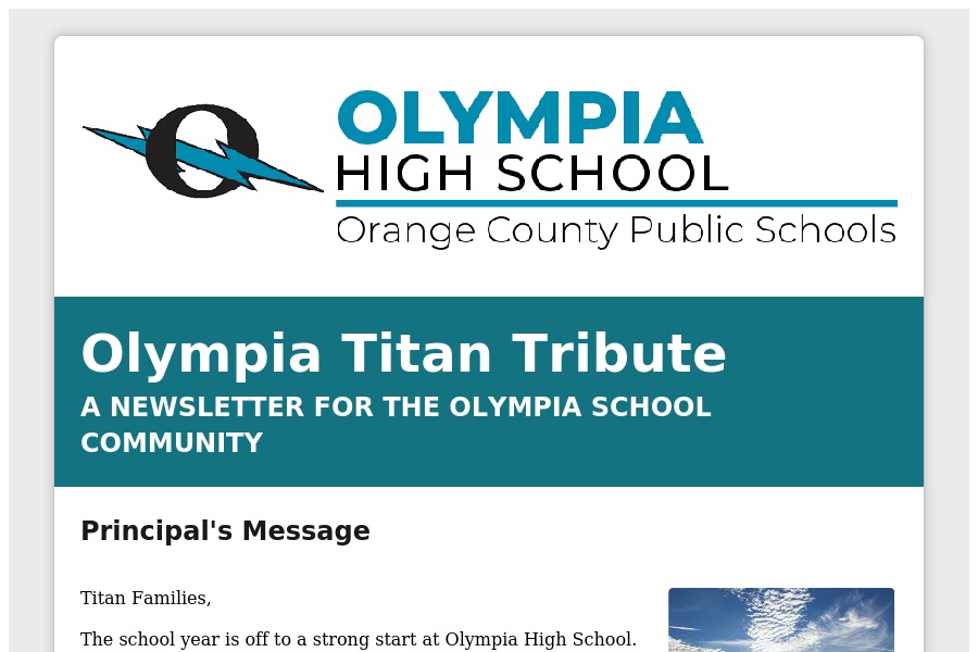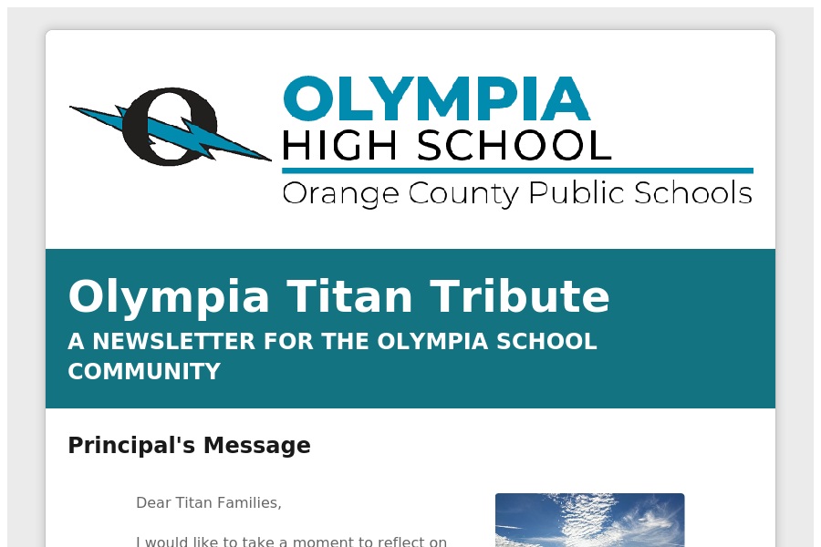 Olympia HS 30% Design Community Meeting- Please join School Board Member Anne Douglas, staff, students and families for the Olympia HS 30% Design Community Meeting to discuss the status of the comprehensive renovations happening to the campus on Monday, Nov. 10 from 6 to 7 p.m. Our school’s address is 4301 S Apopka Vineland Rd, Orlando.